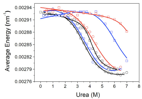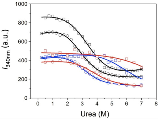 D] = 0–7 M, with increments of 0.25 M). Samples were equilibrated overnight at room temperature before measurements. Guanidinium hydrochloride was avoided because it is a charged denaturant and would interfere with electrostatic interactions between protein charges and it is known to be a stabilizing molecule at low concentration [