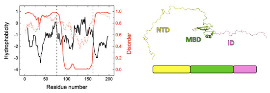 Figure 8 shows the hydrophobicity profile of NTD-MBD-ID, which shows two hydrophobic regions, at the end of NTD and the second half of MBD. Disorder predictions (by DISOPRED3 and IUPRED2 algorithms [