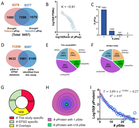 Phosphoproteomic analysis of the drought-treated soybean plants. (A) A Venn diagram shows the numbers of non-redundant, repeatable, and label-independent phosphopeptides (9457) of both drought-tolerant (8378) and -sensitive cultivars (8377, Supplementary Table S2d, Figure S4A). (B) Distribution of the PSM numbers of each soybean phosphopeptide over the rank (or index) of entire population of phosphopeptides (9457). The k (−0.91) represents the slope of fitting curve of the rank-frequency distribution by Zipf’s law (Supplementary Table S2d). (C) Distribution of subgroups of phosphopeptides over the specific number of phosphosite on a phosphopeptide. The pSite stands for phosphosite(s) (Supplementary Table S2d). (D) A Venn diagram shows the overall 11,259 phosphosites deposited in the repository database of EPSD and 8087 phosphosites identified from this study (Supplementary Table S2e). These phosphosites were derived from the 3889 leading proteins (Supplementary Table S2g). (E,F) Classification of 8087 phosphorylation sites from the present study (E) and 11,259 phosphorylation sites from the Eukaryotic Phosphorylation Sites Database (EPSD, http://epsd.biocuckoo.cn/, accessed on 15 August 2020) (F) into the three general categories according to the amino acid sequence specificity of a kinase docking site (Supplementary Table S2e). (G) The number of the leading proteins identified from this study (3889), which include both unique and razor proteins (Supplementary Table S2g) and the EPSD database (3747). The red- (2457), green- (2315), and yellow- (1432) colored part represents the number of proteins specific to this study, proteins specific to EPSD database, overlapping phosphoproteins between this study and EPSD, respectively. (H) The simulated Tree-ring plot [72] represents the relationship between the number of phosphoproteins and the number of phosphosite. The area of each tree ring represents the number of phosphoproteins sharing the same number of phosphosite, whereas the color palette stands for various number of phosphosites on a phosphoprotein. The purple-colored ring 1 to 4 represents the phosphosite number per phosphoprotein varies from 1 to 4, while the blue-colored ring 5 to 17 represents the phosphosite number per phosphoprotein varies from 5 to 17. The green-colored represents those phosphoproteins of phosphosites larger than and equal to 18. The data used in this figure are from the unique phosphoprotein data of this study and those of the EPSD database (Supplementary Table S2i). (I) The power law equation of the fitting curve describes the correlation in between the total number of phosphoproteins (4694) and the specific number of phosphosite (in total). R2 represents the coefficient of the curve determination. The data used in this figure are from the unique phosphoprotein data of this study (1808) and those of the EPSD database (3747, Supplementary Table S2i).