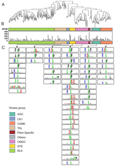 Out of 3889 leading proteins (Supplementary Table S2g), we firstly identified 279 annotated kinases. These kinases were classified into 9 kinase families (Figure 2A and Figure S4; Supplementary Table S3a; Supplementary Table S4) using the bioinformatics tool of iTAK (Plant Transcription factor and Protein Kinase Identifier and Classifier; [60]), among which RLK family has the largest number of kinase members (120), followed by CMGC (34), TKL (32), CAMK (31), AGC (20), STE (15), others (9), CK1 (7), and plant-specific (4) kinase families (Supplementary Table S3a).