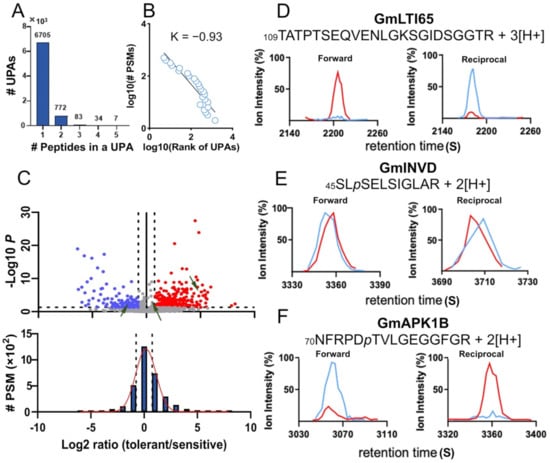 Quantitative proteomic analysis of the drought-tolerant soybean cultivar significantly regulated phosphopeptide groups under drought treatment. (A) Distribution and classification of phosphopeptide groups (or called UPAs, unique PTM peptide array, 7601 in total) according to the number of phosphopeptides present an UPA (Supplementary Table S5a). (B) The rank-frequency distribution of the number of PSMs over the index of UPAs (7601) according to Zipf’s law (Supplementary Table S5a). (C) Volcano plot (upper) and histogram (lower) of quantitative phosphoproteomics. The Log2 ratio is the average binary logarithmic ratio of MS1 isotopologue areas of phosphopeptides, and p is the p-value determined from Student’s t-test. The histogram of Log2 ratios are fitted using a normal distribution (red curve). The vertical and horizontal dashed line indicates the mean ± SD (standard deviation) of the distribution and the cut-off of Benjamini–Hochberg multiple hypothesis test corrected FDR (≤0.05), respectively (Supplementary Table S5b). (D–F) The red and blue circle represents significantly up- and downregulated UPAs, respectively. (D–F) shows the XIC of increased, unchanged and decreased phosphopeptide ratio of drought-tolerant sample to the drought-sensitive sample, respectively. Forward and Reciprocal stands for the experimental replicate of F and R mixing of differentially isotope-labeled total cellular peptides, respectively. Subscript p marks the phosphosite within a measured phosphopeptide. Red lines represent the heavy isotope-labeled phosphopeptides while the blue lines represent the light isotope-labeled phosphopeptides. The number at the N-terminal end of phosphopeptide indicates the amino acid position within a phosphoprotein. The phosphosite and XIC shown in (D–F) are reproduced from soybean protein GmLTI65 (low-temperature-induced 65 kDa Protein, XP_003556105.1-S123), GmINVD (alkaline/neutral invertase D, XP_003536372.1-S47) and GmAPK1B (protein kinase 1B, XP_003523529.1-T75) listed in the Supplementary Table S5b, respectively.