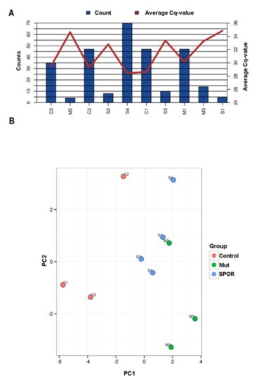 Number of detected miRNAs and PCA. (A) Graphical illustration of the miRNA content. The blue bars represent number of miRNAs detected in each sample and the red line shows the average Cq value for the commonly expressed miRNAs. On X axis the analyzed samples are reported (Controls: C1, C2, C3; Sporadic patients: S1, S2, S3, S4 and Mutated patients: M1, M2, M3). (B) PCA plot. The principal component analysis is performed on all samples, and on the top 25 miRNAs with highest standard deviation. The normalized (dCq) values have been used for the analysis. The largest component in the variation is plotted along the X axis and the second largest is plotted on the Y axis.