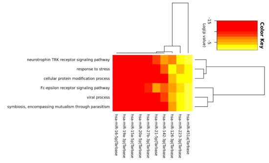 A pathway analysis was then performed on these restricted group of 10 relevant miRNAs. Enrichment in GO categories enabled the identification of miRNA subclasses or GO terms that characterize similar miRNAs. The intersection of the GO categories identified 6 biological processes shared across miRNAs: neurotrophin TRK receptor signaling pathway, response to stress, cellular protein modification process, Fc-epsilon receptor signaling pathway, viral process, symbiosis, encompassing mutualism through parasitism (Figure 3).