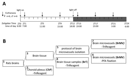 - Zhang, S.L.; Lahens, N.F.; Yue, Z.; Arnold, D.M.; Pakstis, P.P.; Schwarz, J.E.; Sehgal, A. A circadian clock regulates efflux by the blood-brain barrier in mice and human cells. Nat. Commun. 2021, 12, 617. [Google Scholar] [CrossRef]