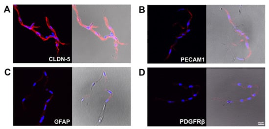 - Winkler, E.A.; Bell, R.D.; Zlokovic, B.V. Pericyte-specific expression of PDGF beta receptor in mouse models with normal and deficient PDGF beta receptor signaling. Mol. Neurodegener 2010, 5, 32. [Google Scholar] [CrossRef] [PubMed] [Green Version]