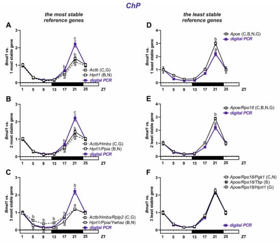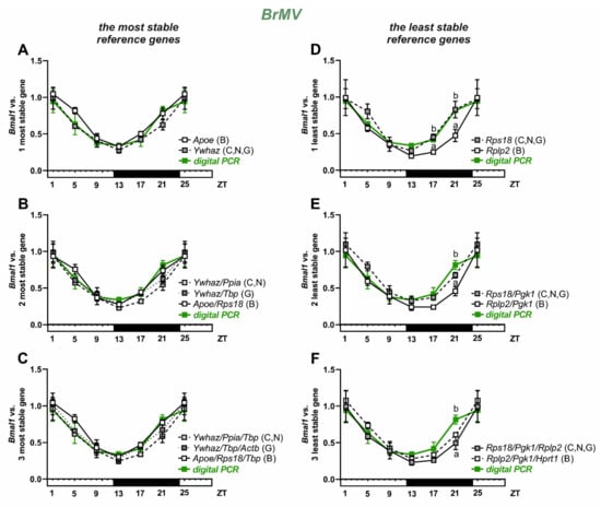 - Nakao, R.; Okauchi, H.; Hashimoto, C.; Wada, N.; Oishi, K. Determination of reference genes that are independent of feeding rhythms for circadian studies of mouse metabolic tissues. Mol. Genet. Metab. 2017, 121, 190–197. [Google Scholar] [CrossRef] [PubMed]