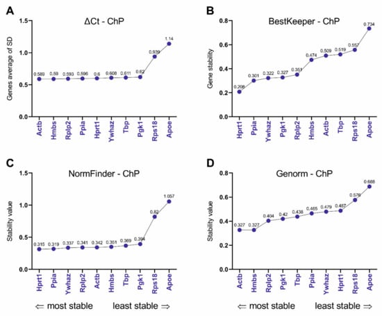 3.4. Selection and Verification of the Most Stable Reference Genes for Choroid Plexus