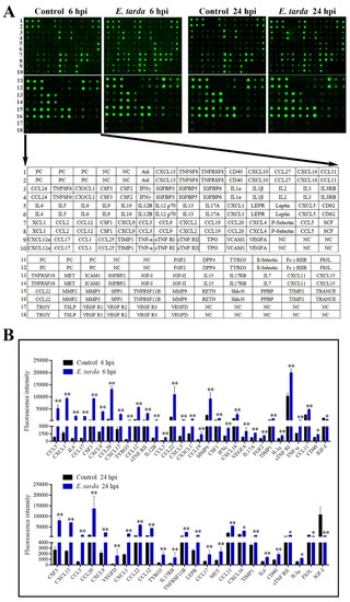 The cytokine expression profiles induced by Edwardsiella tarda. (A) Mice were infected with or without (control) E. tarda, and the expressions of 96 cytokines in the plasma at 6- or 24-hour post-infection (hpi) were detected by an antibody array (upper panel). Each cytokine was assayed in duplicate. The cytokine spots are indicated in the lower panel. PC, positive control; NC, negative control. The data shown are one representative of triplicate experiments. (B) Differentially expressed cytokines at 6 hpi (upper) and 24 hpi (lower) are shown in the histogram. Data are the means of triplicate assays and shown as mean ± SD. * p < 0.05; ** p < 0.01.