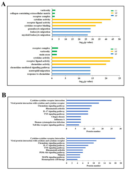 GO and KEGG enrichment of differentially expressed cytokines (DECs). (A) DECs of the top three significantly enriched GO terms at 6 (upper) and 24 (lower) hours post-infection (hpi). CC: Cellular Component, MF: Molecular Function, BP: Biological Process. (B) DECs of the top 10 significantly enriched KEGG pathways at 6 (upper) and 24 (lower) hpi.