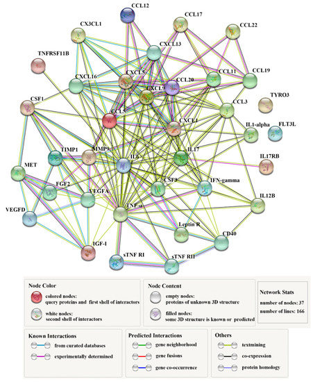 Cytokines are small, soluble proteins produced by certain cells that act largely in a paracrine way to influence the activity of other cells [1]. Cytokine–mediated effects are critical to many biological processes, including inflammation, antimicrobial immunity, and cancer [2,3,4,5]. Cytokines are the most important class of mediators and can amplify and coordinate pro-inflammatory signals that lead to the expression of effector molecules, resulting in the modulation of diverse aspects of innate immunity against infection [6,7]. Currently, the term “cytokine” encompasses many types of proteins, including interleukins, chemokines, and the tumor necrosis factor (TNF) family. Interleukins mediate interactions between immune cells and are able to promote cell proliferation, differentiation, and functional activation [8,9,10,11]. Chemokines induce cell migration and activation by binding to specific G-protein-coupled cell surface receptors on target cells, such as neutrophils, monocytes, and lymphocytes, which play a pivotal role in host immune defense [12,13,14]. TNF–α is a factor with potent pro-inflammatory activity [15]. Members of the TNF family are involved in apoptosis, proliferation, invasion, and the immune response to infection [16,17].