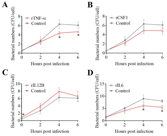 Effects of DECs on Edwardsiella tarda infection. RAW264.7 cells were pretreated with rTNF–α (A), rCSF1 (B), rIL12B (C), or rIL6 (D) and infected with E. tarda for 1 h, and the extracellular bacteria were killed by antibiotic treatment. The cells were then incubated for various times. After incubation, the intracellular bacterial number (shown as colony forming units, CFU) was determined. Values are the means of triplicate experiments and shown as mean ± SD. * p < 0.05.