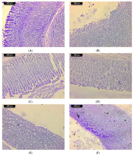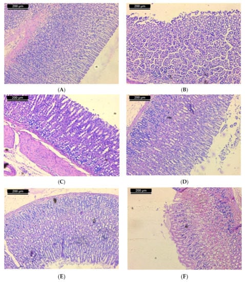 To examine gastric mucosal glycoproteins, stomach sections (5 µm) were stained with periodic acid–Schiff (PAS) to observe changes in glycoproteins [].