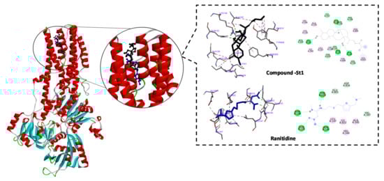 Anti-ulcer drugs have the ability to prevent gastric acidification as the main factor of ulcer formation via gastric H+/K+ ATPase. Accordingly, we investigated the binding mode and affinity of ST-1 with H+/K+ ATPase; ranitidine was used as a positive control []. ST-1 showed a higher affinity to the proton pump than ranitidine (−9.86 vs. −6.21 kcal/mol, respectively) and exhibited a higher estimated inhibition constant (pki values 59.72 nM vs. 27.92 µM, respectively). ST-1 showed interaction with GLN133, ASN143, ASN144, LEU147, VAL344, ALA345, VAL347, GLU801, THR819, ILE822, and ASP826 amino acid residues (Figure 4).