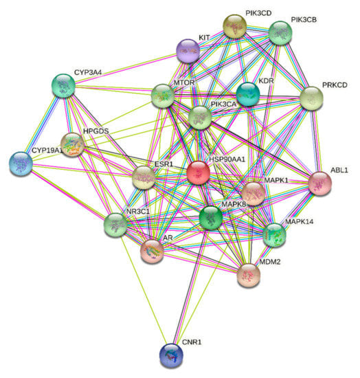 Interestingly, under the “diseases of signal transduction by growth factor receptors and second messengers” pathway, it was found that the PI3K signaling pathway was the most enriched pathway induced by ST-1 treatment among the human biological pathways. Dissection of the PEA analysis combined with reactome mining emphasized that a set of ten genes (PIK3CA, PIK3CB, PIK3CD, ESR1, KIT, MTOR, HSP90AA1, MAPK1, KDR, and MDM2) were significantly modulated as biological targets to ST-1 as a potent anti-ulcer drug. Moreover, the PEA-reactome outcomes disclosed that these ten genes were found to significantly interact with 13 other biological interactors/genes, including P29353, P46531, P48729, Q00987, P31749, P00533, P62993, P27986, P19174, Q07817, Q96B36, and P42336.