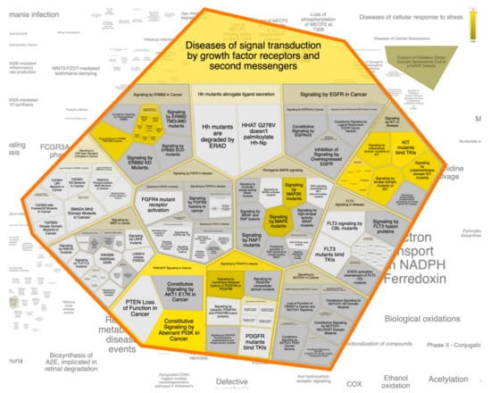 For better and deeper mining/dissection of ST-1 target-function interactions, a Voronoi tree map based on Boolean network modeling and PEA analysis was achieved. The Voronoi tree map was constructed to visualize the top targeted pathway influenced by the top 20 gene targets in response to ST-1 (Figure 7). Furthermore, a reactome graphical representation was built on the top pathway affected in response to ST-1 (Figure 8). Notably, pathways involved in diseases of signal transduction by growth factor receptors and second messengers, as well as disease and immune system pathways, were found to be the most significant pathways targeted by ST-1, with a false discovery rate (FDR) of <0.00001% (Table 3).
