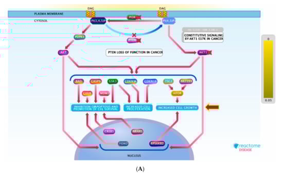 (A) Graphic representation of the diseases of signal transduction by growth factor receptors and (B) second messengers reactome pathway, influenced as a response to ST-1 in the human genome.