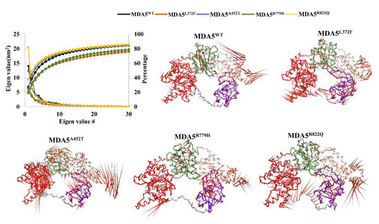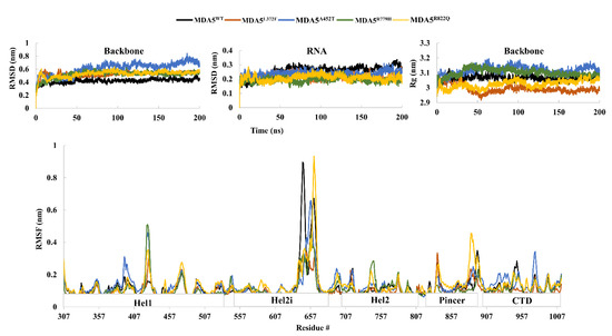 3.2. Structural Dynamics of Wild-Type and Mutant MDA5-dsRNA Bound Complexes