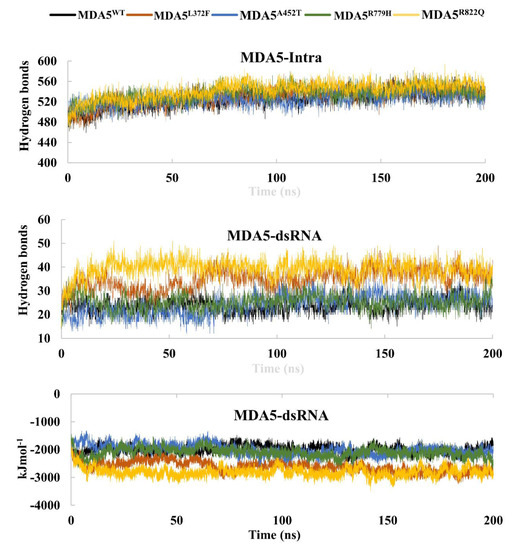 - Preparation and MD simulation of MDA5WT, MDA5L372F, MDA5A452T, MDA5R779H, and MDA5R822Q;