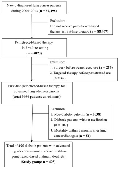 We used TaiwaN′s National Health Insurance Research Database (NHIRD) to analyze the effect of metformin combined with pemetrexed-based platinum doublets as a first-line treatment for diabetic advanced lung adenocarcinoma patients. Based on the flow chart (Figure 1), lung cancer patients newly diagnosed between 2004 and 2013 were initially identified for the study. In total, 92,495 newly diagnosed lung cancer patients were first investigated, including patients treated with pemetrexed that appeared in first-line reagent. Furthermore, we focused on diabetic patients who survived at least 3 months after the lung cancer diagnosis who had received first-line chemotherapy with pemetrexed-based platinum doublets. Finally, a total of 495 diabetic patients newly diagnosed with advanced lung adenocarcinoma receiving first-line pemetrexed-based platinum doublets were enrolled in our study.