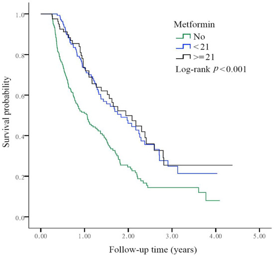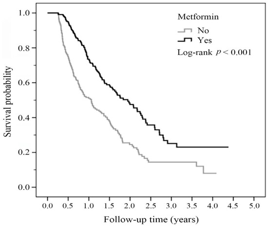 We analyzed the overall survival status using the Kaplan-Meier method, and the significance was determined by a log-rank test. As shown in Figure 2, we found that the metformin user group had a better prognosis and improved survival outcome compared with the prognosis and survival rate of the non-metformin user group. The p value for the log-rank test was less than 0.001 (Figure 2).