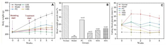 Effects of oral SS administration on the body weights and FBG level of T2D rats. (A) Body weights; (B) body weight growth rate; (C) FBG levels. Normal: normal group; Model: diabetic model group; PC: 0.5% metformin administration; LSS, MSS, and HSS: 1%, 2.5, and 5% SS administration, respectively; n = 10, ** p < 0.01, vs. normal group; ## p < 0.01, vs. model group.