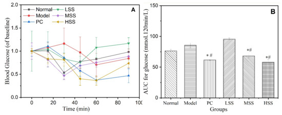 Effect of oral SS administration on the ITT results of T2D rats. (A) ITT results, with baseline blood glucose levels set to 100%; (B) AUC of ITT. Normal: normal group; Model: diabetic model group; PC: 0.5% metformin administration; LSS, MSS, and HSS: 1, 2.5, and 5% SS administration. n = 3, * p < 0.05, vs. normal group; # p < 0.05, vs. model group.