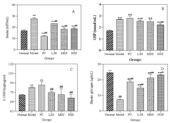 Effects of oral SS administration on physiological indexes of T2D rats. (A) Insulin; (B) GSP level; (C) 8-OHdG level; (D) Hepatic glycogen. Normal: normal group; Model: diabetic model group; PC: 0.5% metformin administration; LSS, MSS, and HSS: 1, 2.5, and 5% SS administration; n = 3, ** p < 0.01, vs. normal group; ## p < 0.01, vs. diabetic model group.