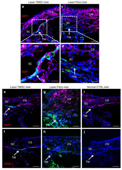 - Yun, H.; Wang, Y.; Zhou, Y.; Wang, K.; Sun, M.; Stolz, D.B.; Xia, X.; Ethier, C.R.; Du, Y. Human stem cells home to and repair laser-damaged trabecular meshwork in a mouse model. Commun. Biol. 2018, 1, 216. [Google Scholar] [CrossRef]