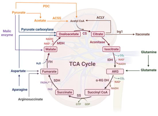 The tricarboxylic acid (TCA) cycle. The TCA cycle is an amphibolic route with anabolic and catabolic reactions. Anaplerotic reactions include the net input of amino acids in the cycle and the generation of oxaloacetate from pyruvate through pyruvate carboxylase. Among the main products of the TCA cycle are guanosine triphosphate (GTP), dinucleotide nicotinamide molecules (NADH), and dinucleotide adenine flavine molecule (FADH2); the latter are electron donors to feed the electron transport system (ETS). PDC: pyruvate dehydrogenase complex, ACSS: acetyl CoA synthetase, ACLY: ATP-citrate lyase, Irg1: the immune responsive gene 1 protein, CS: citrate synthase, IDH: isocitrate dehydrogenase, AKG DH: alpha-ketoglutarate dehydrogenase, SS: succinyl CoA synthetase, SDH: succinate dehydrogenase, FH: fumarate hydratase, MDH: malate dehydrogenase, NAD+: nicotinamide adenine dinucleotide (oxidized form), FAD: flavine adenine dinucleotide (oxidized form), GDP: guanosine diphosphate. Created with Biorender.com.