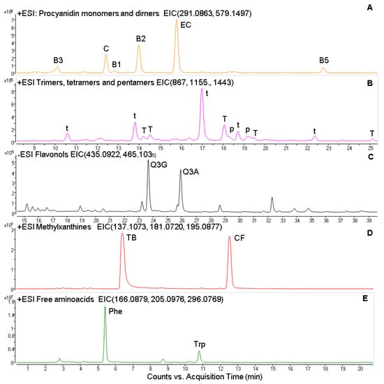 Extracted ion chromatogram (EIC) from the ESI positive analysis of Procyanidin monomers and dimers (A); trimers, tetramers, and pentamers (B); flavonols (C); methylxanthines (D) and free aminoacids (E). C, catechin; EC, epicatechin, B1, B2, B3, and B5 procyanidin dimers; t, procyanidin trimer; T, procyanidin tetramer; p, procyanidin pentamer; TB, theobromine; CF, caffeine; Phe, l-phenylalanine; Trp, l-tryptophan.