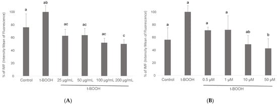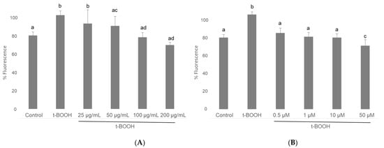 A powerful pro-oxidant such as t-BOOH can directly decompose to peroxyl radicals and generate lipid peroxides and other ROS, thus increasing fluorescence by binding to dichlorodihydrofluorescein (H2DCFDA) diacetate and generating fluorescent compound DFC. In order to optimize our working conditions, we established the working concentration by performing a dose response curve (data not shown). After exposing the cells to 500 µM t-BOOH for 1 h, the maximum amount of ROS is produced, and thus this treatment represents our control for oxidative stress.