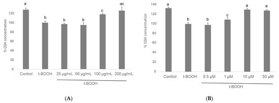When differentiated SH-SY5Y cells were submitted to a situation of oxidative stress by the administration of 500 µM t-BOOH for 1 h, GSH concentration decreased to around 50% of basal levels (Figure 5). This severe decrease of GSH was partially reversed by a pre-treatment of cells for 3 h with 100 µg/mL of cocoa extract and completely reverted to control values with 200 µg/mL. Similarly, a partial but significant recovery of depleted GSH was observed in differentiated SH-SY5Y cells pre-treated with 1 µM EC for 3 h before the oxidative challenge, whereas pre-treatment with 10 or 50 µM EC evoked a complete recovery of GSH (Figure 5).