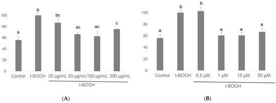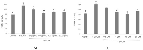 Effect of pre-treatment of differentiated SH-SY5Y cells with cocoa extract (A) and EC (B) prior to oxidative stress on GPx activity. Values are means ± SD, n = 3. Values are expressed as a percent relative to the control condition. Different letters indicate statistically significant differences (p < 0.05) among groups.