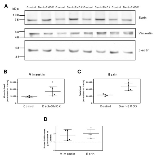 Increased levels of ezrin and vimentin in Dach-SMOX cerebral cortex. Western blot analysis on cerebral cortex homogenate from Dach-SMOX and control mice using antibodies against ezrin and vimentin. (A) Aliquots (25 µg/lane) of total crude preparations, containing both synaptosomes and gliosomes, were submitted to 8% SDS-PAGE followed by Western blot for ezrin and vimentin. The membrane was stripped and re-probed for β-actin. Four controls, as well as four Dach-SMOX mice, were analyzed. Protein standard molecular weights are reported (kDa). (B,C) The relevant immunoreactive bands were quantified and normalized versus β-actin. Data are reported as filled squares (control) and filled triangles (Dach-SMOX). Mean and SD are also reported (n = 4). * p ≤ 0.05, according to Mann-Whitney test. (D) The fold increase for ezrin and vimentin in Dach-SMOX mice is shown. Data are reported as filled squares (vimentin) and filled triangles (ezrin). Mean and SD are also reported (n = 4).