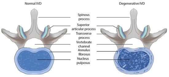 Intervertebral disc degeneration (IVDD) (Figure 1) is a common pathology of the spine that significantly reduces the quality of life and performance of patients [1]. Neurologists, therapists, rheumatologists and orthopedists take part in the observation and treatment this disorder. Chronic pain syndromes associated with IVDD lead to significant economic losses [2,3]. About 80–90% of patients with acute low back pain (LBP) have persistent regression of pain syndrome after conservative treatment, but the remaining 10–20% develop chronic pain syndrome [4]. The pain chronicity leads to an increase in the temporary disability periods in patients and sometimes to their disability [5].