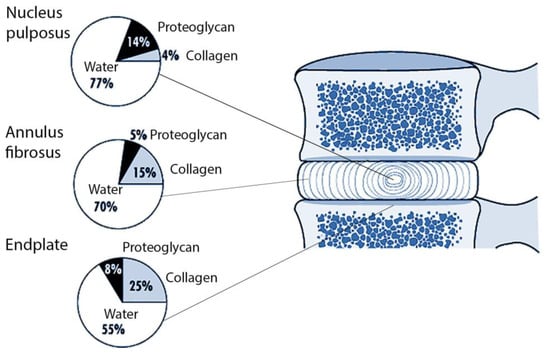 - Antoniou, J.; Steffen, T.; Nelson, F.; Winterbottom, N.; Hollander, A.P.; Poole, R.A.; Aebi, M.; Alini, M. The human lumbar intervertebral disc. Evidence for changes in the biosynthesis and denaturation of the extracellular matrix with growth, maturation, ageing, and degeneration. J. Clin. Investig. 1996, 98, 996–1003. [Google Scholar] [CrossRef]