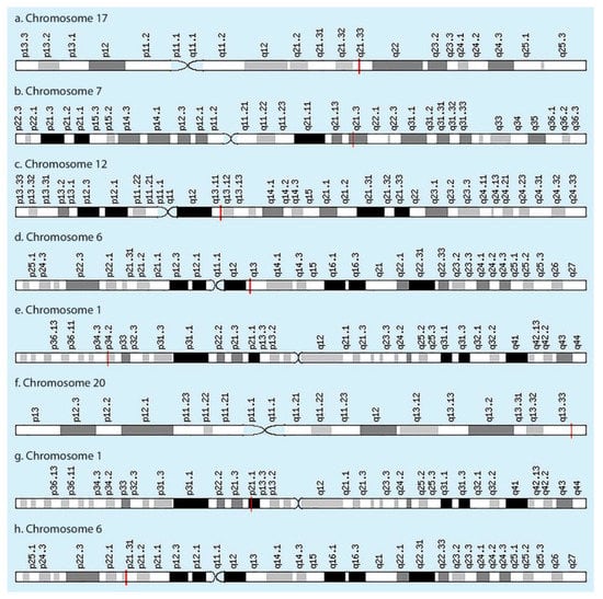 Chromosomal localization of the collagen-encoding genes: (a) COL1A1; (b) COL1A2; (c) COL2A1; (d) COL9A1; (e) COL9A2; (f) COL9A3; (g) COL11A1; (h) COL11A2.