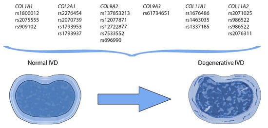 It was previously found that variation in the sequence of intron 9 of the COL11A2 gene is associated with an increased risk of IVDD compared to people without this polymorphism (the magnitude of the IVD bulge forward and backward along the sagittal midline was estimated using magnetic resonance imaging (MRI) as a sign of degeneration). Another large study, conducted with the participation of men in Finland, showed that two SNVs (rs1463035, rs1337185) of the COL11A1 gene and one of the three studied SNVs (rs2076311) of the COL11A2 gene were associated with certain disc bulges and signal intensity from them on MRI data. These SNVs may play a role in the production of unstable transcripts of the disease-associated allele. Instability of gene transcription can cause a decrease in collagen function and subsequent degeneration of the IVD [7,30,71].