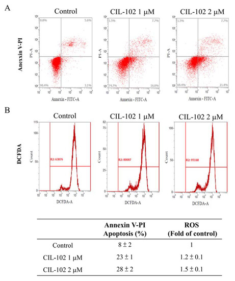 CIL-102 treatment induces cell apoptosis and the ROS production of DLD-1 cells. (A) FITC-conjugated Annexin-V and PI stainings of DLD-1 cells, with or without CIL-102 treatment, for 24 h were performed by flow cytometry analysis, as described in the Materials and Methods sections. The percentages of the apoptotic or neurosis cells in these treated cells are shown in each frame, as indicated. (B) Intracellular ROS of DLD-1 cells treated, with or without CIL-102, at 1- and 2-μM concentrations for 24 h was measured by a FACS analysis, as described in the Materials and Methods sections. Representative histograms of typical H2DCFDA profiles are shown. The production of ROS was expressed as the fold of the control group. Data are presented, based on three independent experiments, as mean ± S.D.