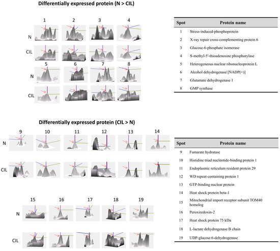The representative two-dimensional gel electrophoretograms of DLD-1 cells, with or without the CIL-102 treatment. Six pairs of cell protein extracts from the CIL-102-treated and untreated DLD-1 cells were evaluated, and a representative pair of the proteomic gel images are shown. Nineteen protein spots (the upregulation of eight protein spots and the downregulation of 11 protein spots in the CIL-102-treated group) with a three-fold difference between both groups, were subjected to a MALDI-TOF-TOF analysis. The full names of these differentially displayed protein spots are encircled and annotated in Table 1, respectively.