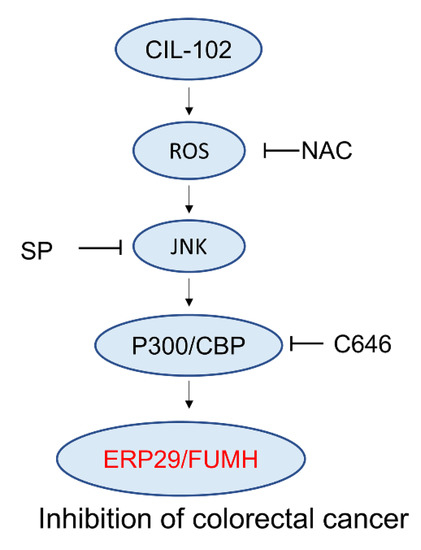 In conclusion, on the basis of proteomic differential proteins, we suggest the upregulation of ERP29 and FUMH expression by CIL-102 via the activation of the JNK/p300 CBP pathway and the induction of ROS production (Figure 7). This study is potentially interesting with respect to its novel chemotherapeutic approach of using CIL-102 to treat malignant CRC and cancer development.