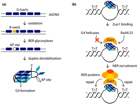 (a) Induction of BER-dependent G4 formation by oxidative stress. Removal of 8-oxoG by OGG1 glycosylase results in an AP site that destabilizes the DNA duplex and makes the formation of G4 by a G4 motif with five G-tracts more favorable. (b) Recognition, stabilization and protection against G4-unwinding helicases of G4 structures by the Zuo1 protein stimulates the repair of UV-induced damage (T=T corresponds to thymine dimer) via the NER pathway by recruiting the Rad4/23 complex.