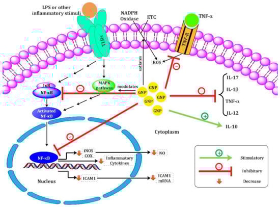 The adopted mechanisms for anti-inflammatory effects of GNPs include; (1) modulation of MAPK and PI3K pathways in Kupffer cells (liver macrophages) and hepatic cells, and the MAPK pathway, a key mechanism of inflammatory signal transduction from the cell surface to the nucleus, which leads to activate transcription factors and alterations in gene expression following LPS binding to TLRs. The PI3K pathway is involved in gene expression, protein synthesis, cell proliferation, and cytokine stimulation. GNPs negatively regulate Kupffer and hepatic satellite cells’ activity and affect their pro-inflammatory cytokine profile and oxidative stress via the modulation of AKT/PI3K and MAPK signaling pathways. In addition, the GNP treatments could reduce the activation of NF-κB through ERK1/2MAPK/Akt/tuberin-mTOR pathway-mediated targeted inflammatory gene expression and cellular stress responses. (2) Significant inhibiting the production of several pro-inflammatory cytokines such as LPS-triggered TNF-α, IL-1β, and IL-17, which can downregulate IL-1β-induced epithelial cells proliferation. Moreover, GNPs could decrease the raised level of IL-12 production, which could leads to a change in the cell-mediated immune response of pro-inflammatory response (TH1) to anti-inflammatory response (TH2). (3) Reducing ROS production; the reactive oxygen species (ROS) are oxygen metabolites (OH−, O2−, H2O2) that have potent oxidizing features and can oxidize proteins and lipids in the cells and causes DNA damage. Reactive nitrogen species (RNS) are a combination of superoxide anion (O2−) and NO, which induce nitrosative stress and promotes the production of ROS. GNPs could lead to satiating and downregulating the phagocyte-produced ROS in a dose-dependent manner. Therefore, GNPs act as potential anti-oxidant and anti-inflammatory agents.