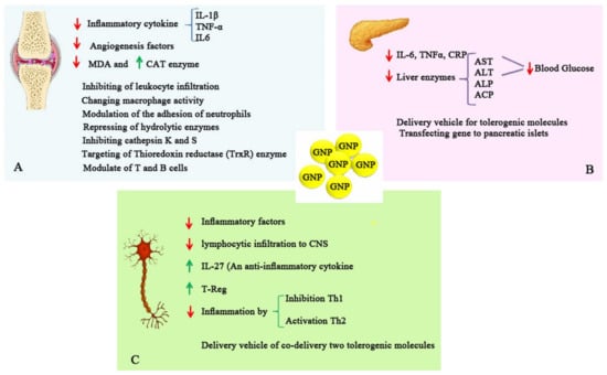 Simplified illustration of immunomodulatory effects of GNPs and their therapeutic applications in autoimmune diseases, including (A) rheumatoid arthritis, GNPs exert anti-inflammatory and anti-oxidant effects; (B) diabetes, anti-inflammatory and anti-oxidant effects, and their application as a gene delivery carrier; and (C) multiple sclerosis; anti-inflammatory and anti-oxidant effects accompanied by application as a delivery system to inducing tolerance.