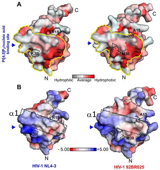 - Tang, C.; Loeliger, E.; Luncsford, P.; Kinde, I.; Beckett, D.; Summers, M.F. Entropic switch regulates myristate exposure in the HIV-1 matrix protein. Proc. Natl. Acad. Sci. USA 2004, 101, 517–522. [Google Scholar] [CrossRef] [Green Version]