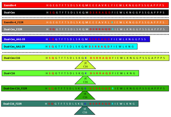 Figure 1. Amino acid sequences of all peptides. Sequence stretches of the dual agonist peptides derived from Glucagon are marked in bold red letters. Substitution of a Phe residue at position 22 by Arg is indicated in bold cyan letters. In the fatty acid-conjugated peptides, Ser in position 2 was replaced by d-Ser and Met at position 14 was replaced by Lys (blue), which was conjugated to γ-glutamic acid followed by a fully saturated palmitic acid chain indicated by triangles.