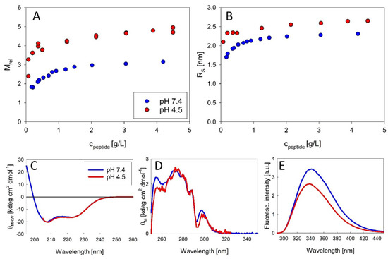 Figure 2. Structural parameters of exendin-4 at pH 7.4 and pH 4.5. (A,B) show association equilibria in the context of relative molecular masses Mrel (A) and Stokes radii RS (B) measured at 23 °C. Far-UV CD (C), near-UV CD (D) and Trp fluorescence (E) spectra were measured at peptide concentrations > 0.1 mM, indicative of exendin-4 in the oligomeric state and fluorescence intensity is shown normalized to peptide concentration. Light scattering data for exendin-4 at pH 7.4 have been published previously [4].