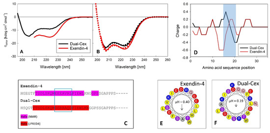 Figure 4. Secondary structure of exendin-4 and Dual-Cex. Far-UV CD spectra of exendin-4 and Dual-Cex were measured in PBS (A) and in 30% TFE (B) at pH 7.4 at concentrations < 0.1 mM which grant a monomeric state of all peptides. Amino acid sequence alignment of exendin-4 and Dual-Cex. (C) Amino acids in an α-helical conformation as derived from NMR experiments or predictions (JPRED4 [23]) are colored pink and red, respectively. A charge plot of exendin-4 and Dual-Cex calculated with the Emboss charge tool [24], using a sliding window of five, is shown in (D). The blue frames in (C) and (D) indicate the main difference between both peptides originating from the sequence stretch engineered into the exendin-4 backbone from oxyntomodulin in Dual-Cex. Helical wheel projections of exendin-4 (E) and Dual-Cex (F) using amino acids 6–28 comprising the central helical part of both peptides were calculated with HeliQuest [25]. Hydrophobic moments (µH) are indicated.