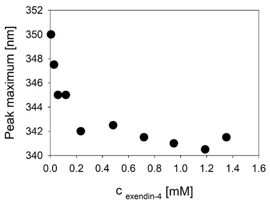 Concentration-dependent measurements of Trp fluorescence indicate that self-assembly of exendin-4 into trimers is accompanied by either shielding or conformational changes of the conserved hydrophobic moiety. This is expressed in a reduced solvent exposure reported by a shift of the fluorescence emission maximum to lower wavelengths (Figure 5).
