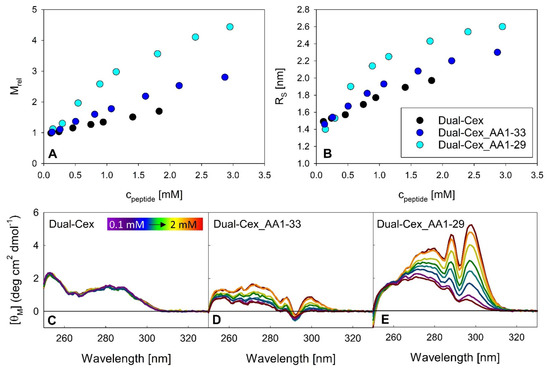 Figure 7. Structural consequences of C-terminal truncation of Dual-Cex. (A,B) show association equilibria in the context of relative molecular masses Mrel (A) and Stokes radii RS (B) of Dual-Cex and two C-terminally truncated Dual-Cex variants measured at 23 °C. Near-UV CD spectra (CE) were measured for a peptide concentration range from around 0.1–2 mM.